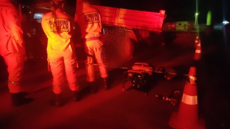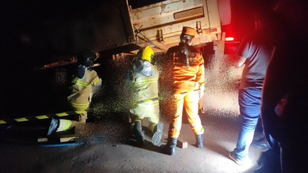 Uma equipe do Corpo de Bombeiros foi acionada para retirar o corpo do trabalhador que ficou preso entre a caçamba e o chassi do veículo.