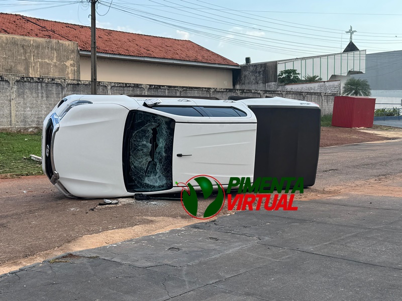 De acordo com informações apuradas no local, dois veículos se chocaram com violência. A batida foi tão forte que uma caminhonete Toyota Hilux branca acabou capotando e ficou tombada de lado no asfalto, chamando a atenção de quem passava pela região. O outro veículo envolvido foi um Volkswagen Gol preto, que teve a parte dianteira bastante danificada.