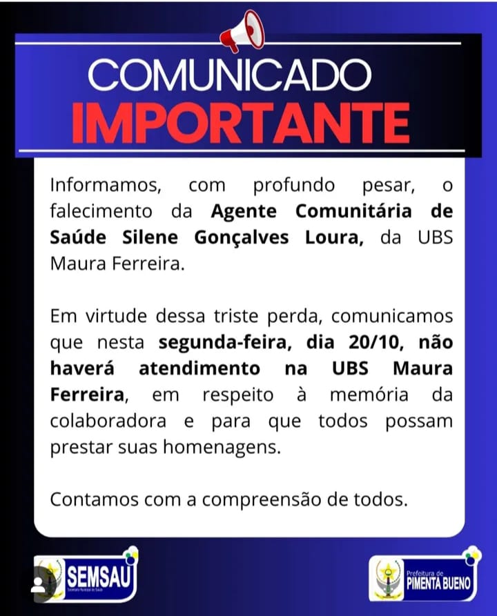Em virtude dessa triste perda, comunicamos que nesta segunda-feira, dia 20/10, não haverá atendimento na UBS Maura Ferreira, em respeito à memória da colaboradora e para que todos possam prestar suas homenagens.