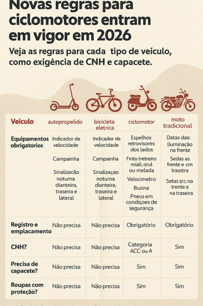 A partir de janeiro de 2026, ciclomotores, bicicletas elétricas e veículos autopropelidos — como patinetes, skates motorizados e cadeiras de rodas com motor — passarão a seguir novas regras em todo o país. As normas foram aprovadas pelo Conselho Nacional de Trânsito (Contran) em junho de 2023 e definem critérios de enquadramento, exigência de equipamentos, regras de circulação e até necessidade de habilitação.