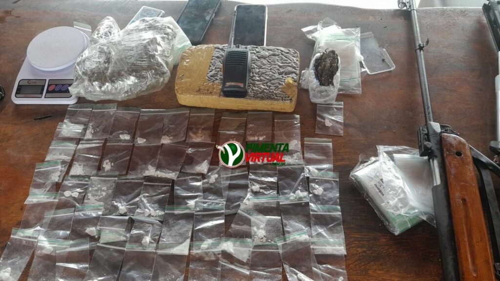 No local, os policiais abordaram um casal, onde inicialmente foram encontradas pequenas porções de cocaína. Durante uma varredura mais detalhada pelo terreno, os militares localizaram, dentro de um buraco próximo a um chiqueiro, uma bolsa contendo grande quantidade de drogas, além de embalagens para comercialização, duas balanças de precisão e partes de armas de fogo.