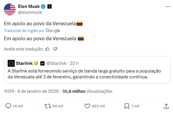 De acordo com a publicação, o serviço gratuito ficará disponível até o dia 3 de fevereiro, com o objetivo de garantir conectividade contínua à população do país em meio a um cenário de instabilidade. O anúncio foi replicado pelo empresário Elon Musk, fundador da SpaceX, que acrescentou a mensagem: “Em apoio ao povo da Venezuela”.