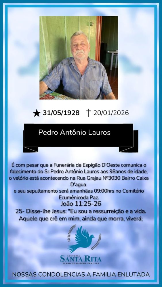 Nota de pesar pelo falecimento de Pedro Antônio Lauros