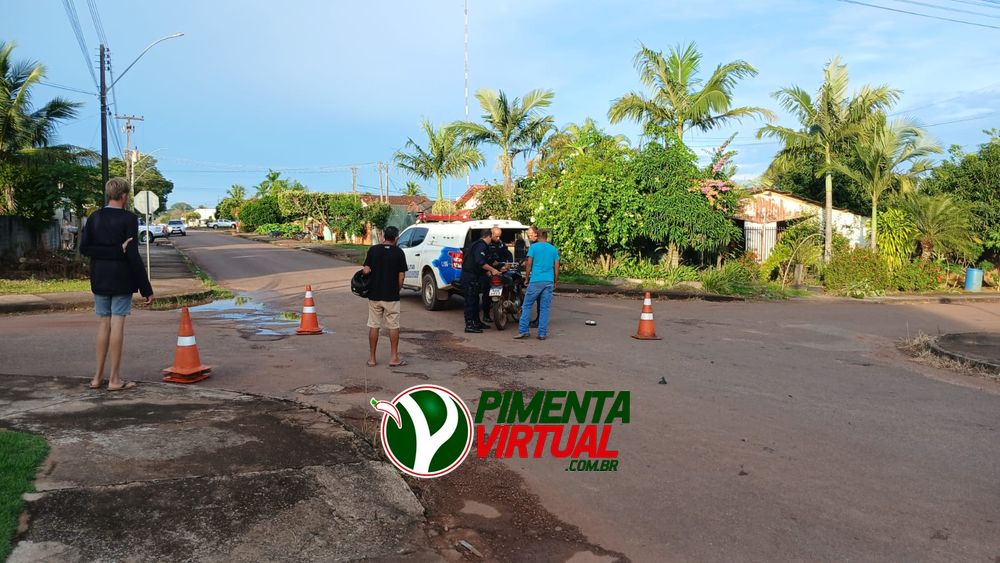 Um acidente envolvendo um carro e uma motocicleta foi registrado na Rua Governador Jorge Teixeira, no bairro Liberdade, em Espigão do Oeste.